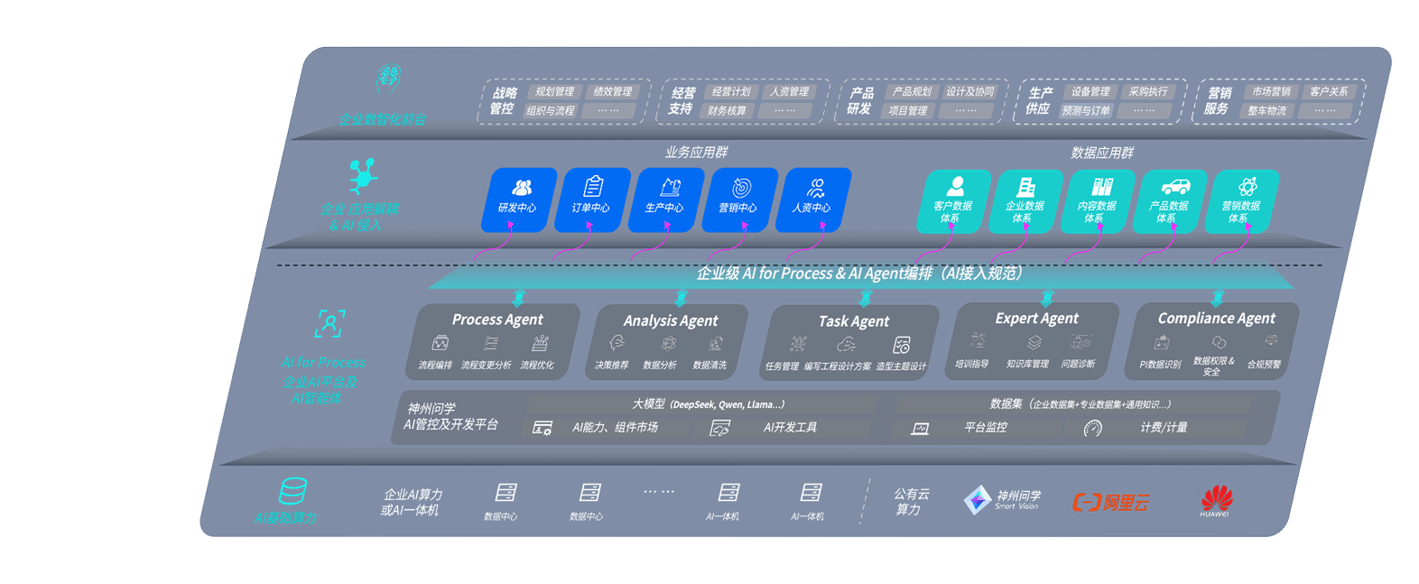 端到端的一站式AI工作空间深度融合了从企业战略规划到日常经营的全流程业务板块,,定向解决车企内部领域多、、部门多、、、链条长、、、场景碎片化等难题,,,支持车企快速构建以AI为核心的生产力写作体系,,,实现任务执行与AI能力的无缝集成与交互