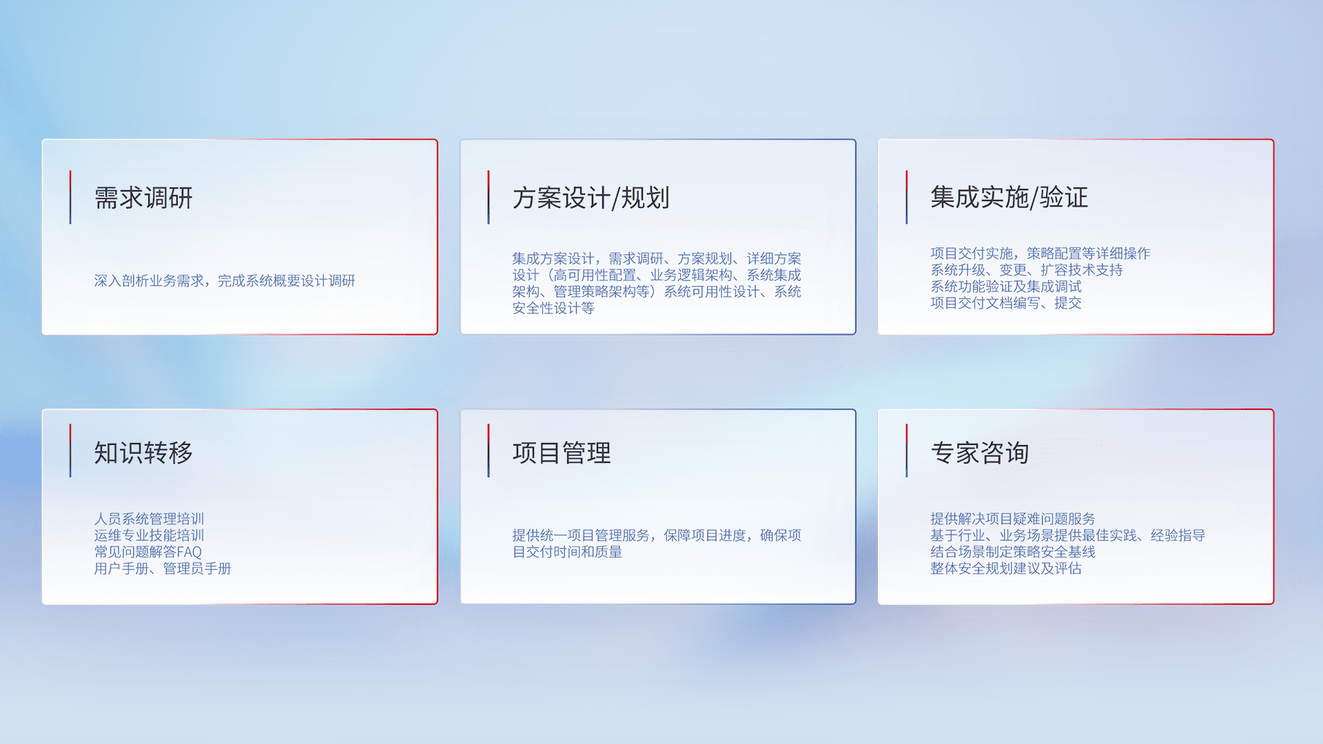 针对客户行业特性,,,,将宏观的安全战略和需求,,,,通过专业的交付服务,,,实现项目落地,,,为客户提供标准规范的集成交付服务。。。。